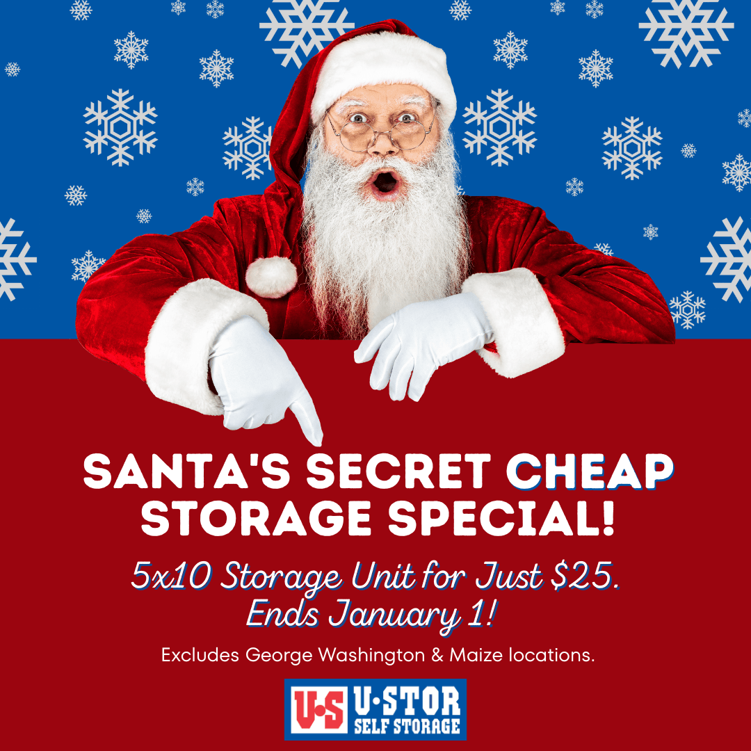 Ho ho hold on…a storage unit for just $25?! That’s less than most fast food orders these days! This December, we’re gifting even bigger deals for cheap storage units in Wichita! Our Santa’s Secret Special is perfect for hiding presents from curious eyes or stashing away clutter for incoming family for the holidays. 👀